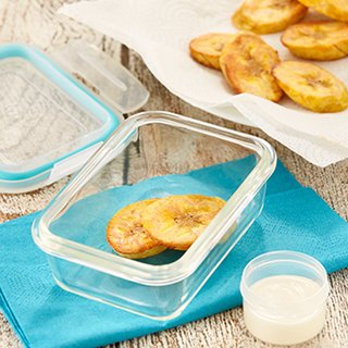 1. Preheat the oven to 180C (fan). Slice the ends off the plantain, remove the peel and cut diagonally into thick slices.