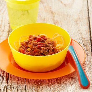 7. Put the pasta in a bowl, place quarter of the bolognese mix over the top and serve with a fork. Chop the meal if preferred.