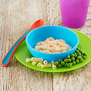 Blend or mash the cooked dish until it is smooth with soft lumps, reserving some pasta for a finger food. Serve with the peas on the side.
